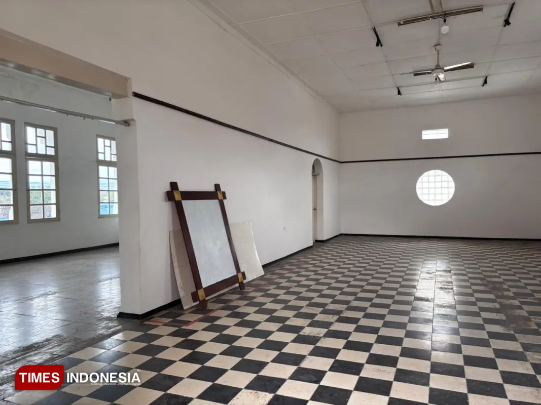 Ruang lantai dua POP Mason 52 yang masih mempertahankan lantai hitam putih khas bangunan lama, dahulu menjadi tempat berkumpul anggota Freemason. (Foto: Lusia Dian Finnadi/TIMES Indonesia)