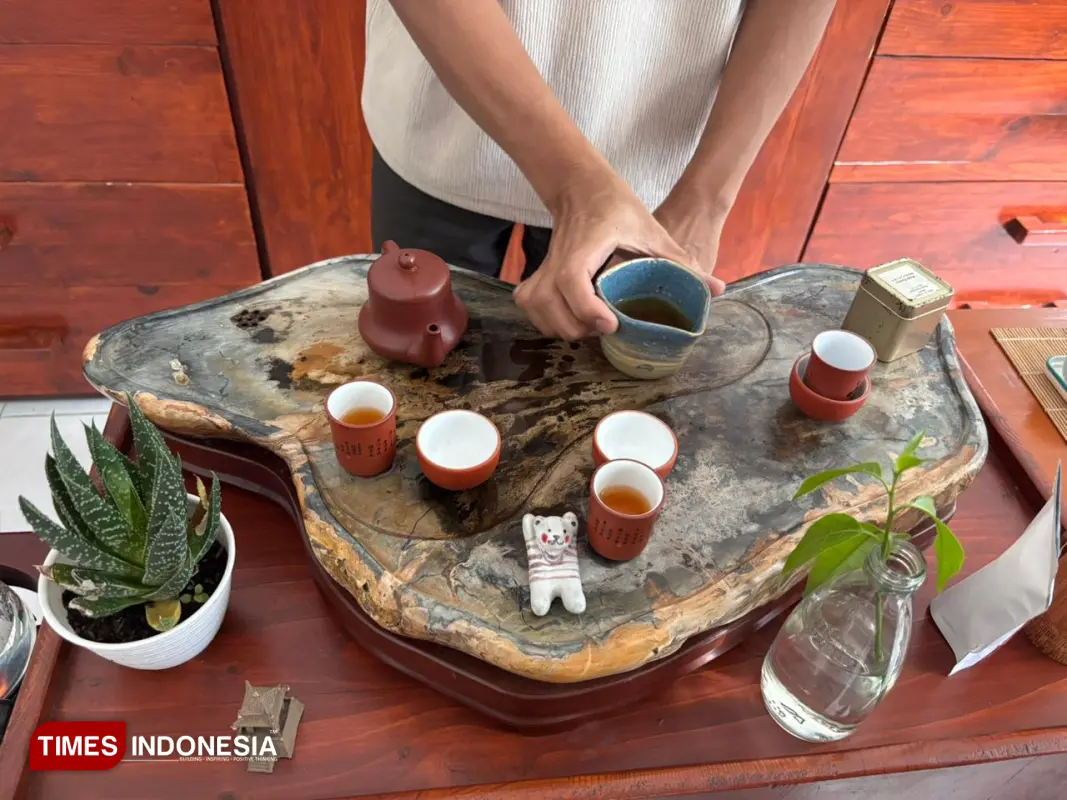 Proses penyeduhan teh dengan tradisi Gong Fu Cha di POP Mason 52 Malang yang menekankan ritual dan ketelitian dalam menikmati teh. (Foto: Lusia Dian Finnadi/TIMES Indonesia)