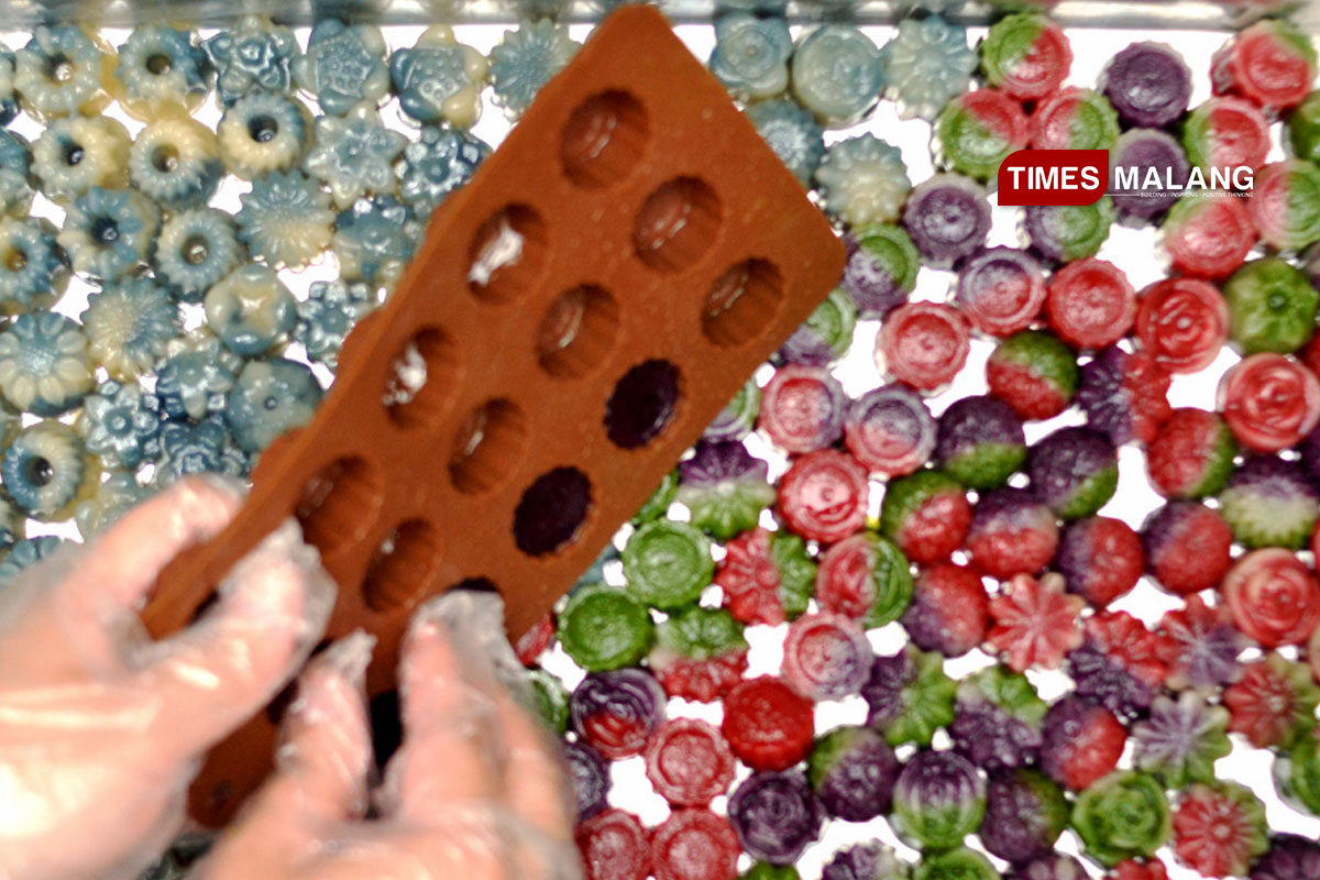 TIMES Malang/Sonia Winoto saat menunjukan kue keranjang buatanya dengan berbagai motif dan warna yang menarik, Rabu 4/2/2026. (FOTO: Adhitya Hendra/TIMES Indonesia)