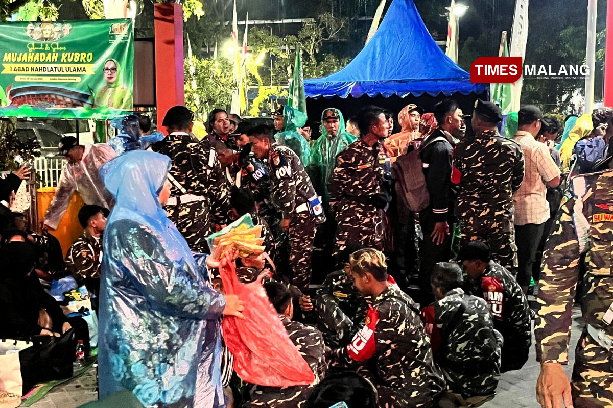 MALANG – Jelang dimulainya gelaran Mujahadah Kubro 1 Abad NU yang berpusat di Stadion Gajayana Malang, Sabtu (7/2/2026), sekitaran lokasi kini tengah diguyur hujan yang cukup lebat. Kondisi ini, membuat para penjual mantel kresek ketiban berkah.