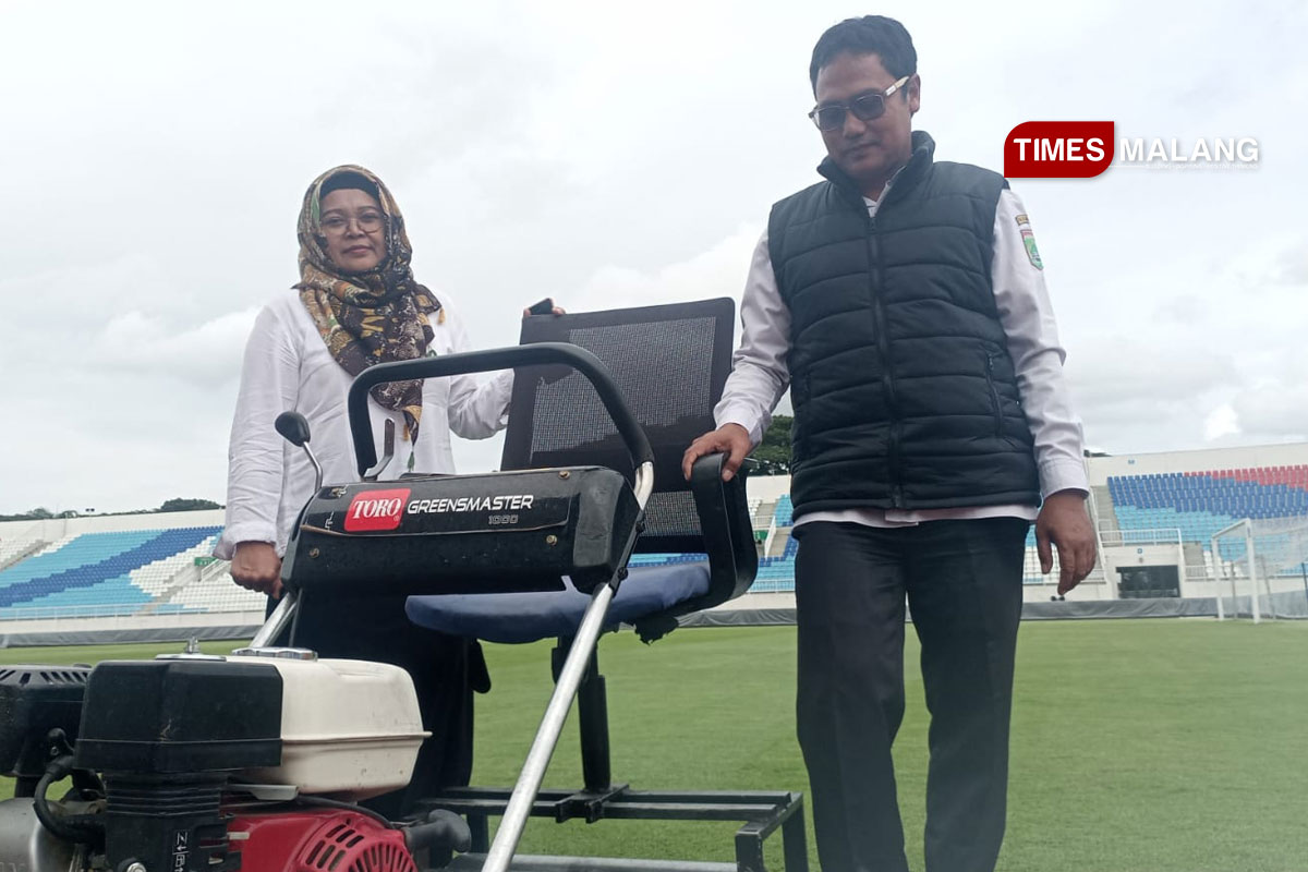 MALANG – Perawatan lapangan stadion dengan kombinasi pola membutuhkan waktu dan biaya yang tidak sedikit. Namun, inovasi alat mesin buatan Mohamad Samsu Arifin (35), staf Dinas Pemuda dan Olahraga (Dispora) Kabupaten Malang, membuat perawatan rumput Stadion Kanjuruhan Kabupaten Malang menjadi lebih efisien.