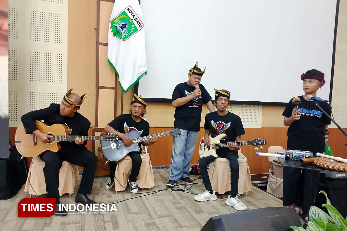 BATU – Penampilan Dito, vokalis Grup Band PD asal Kota Batu, sukses membuat seisi ruangan bergoyang dan bertepuk tangan mengikuti irama lagu. Gen-Z ini bukan hanya piawai menguasai panggung, tetapi juga mampu membawakan lagu legendaris “Berita Cuaca” yang diciptakan pada 1982 dengan penuh penghayatan.
